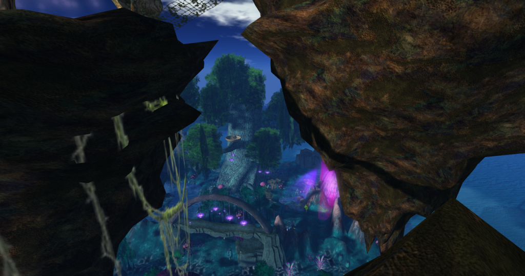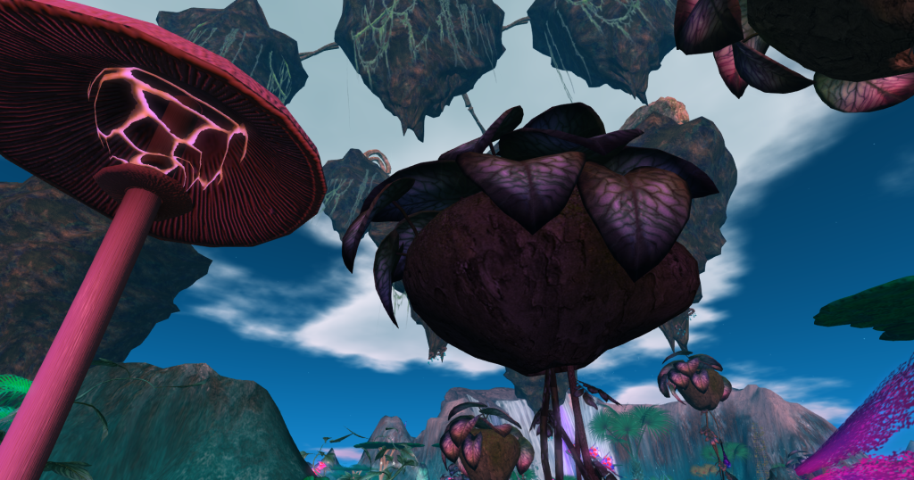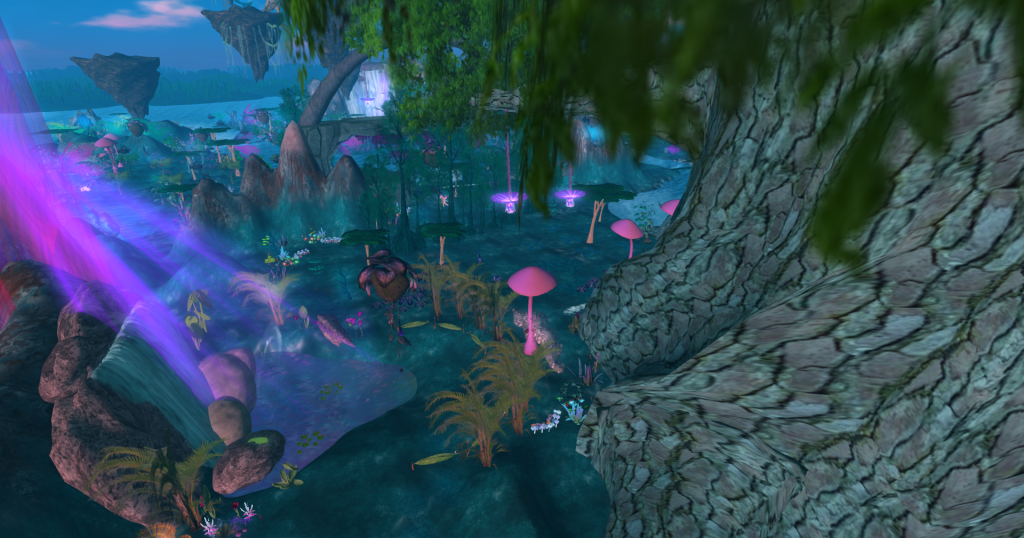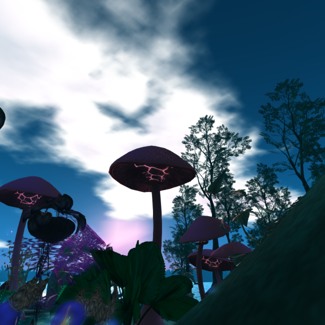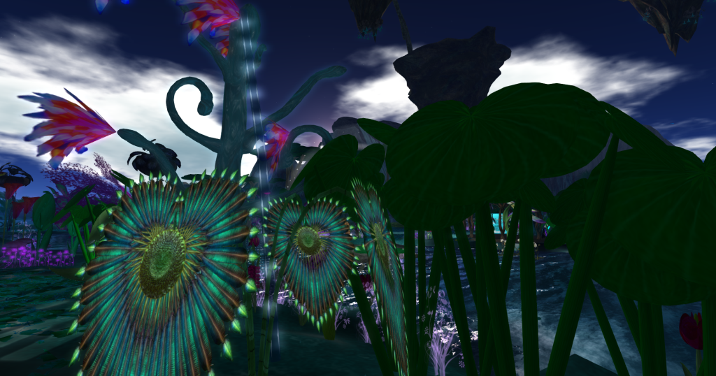 Thank you to the numerous creators of this project. Ferd Frederix, Joe Builder, Roland Francis, Kayaker Magic, and Tiffany Magic. Linda Kellie’s pant leg sculpts created the trumpet flowers here; she also created the Na’vi outfit with Feathers, thank you, Linda.  Sunbeam Magic, Jamie Wright, Leora Jacobus and Minethere Always, thank you for visiting the original Blue Moon and offering whatever you could to the project.  Recreated from the Virtual Highway build 2012